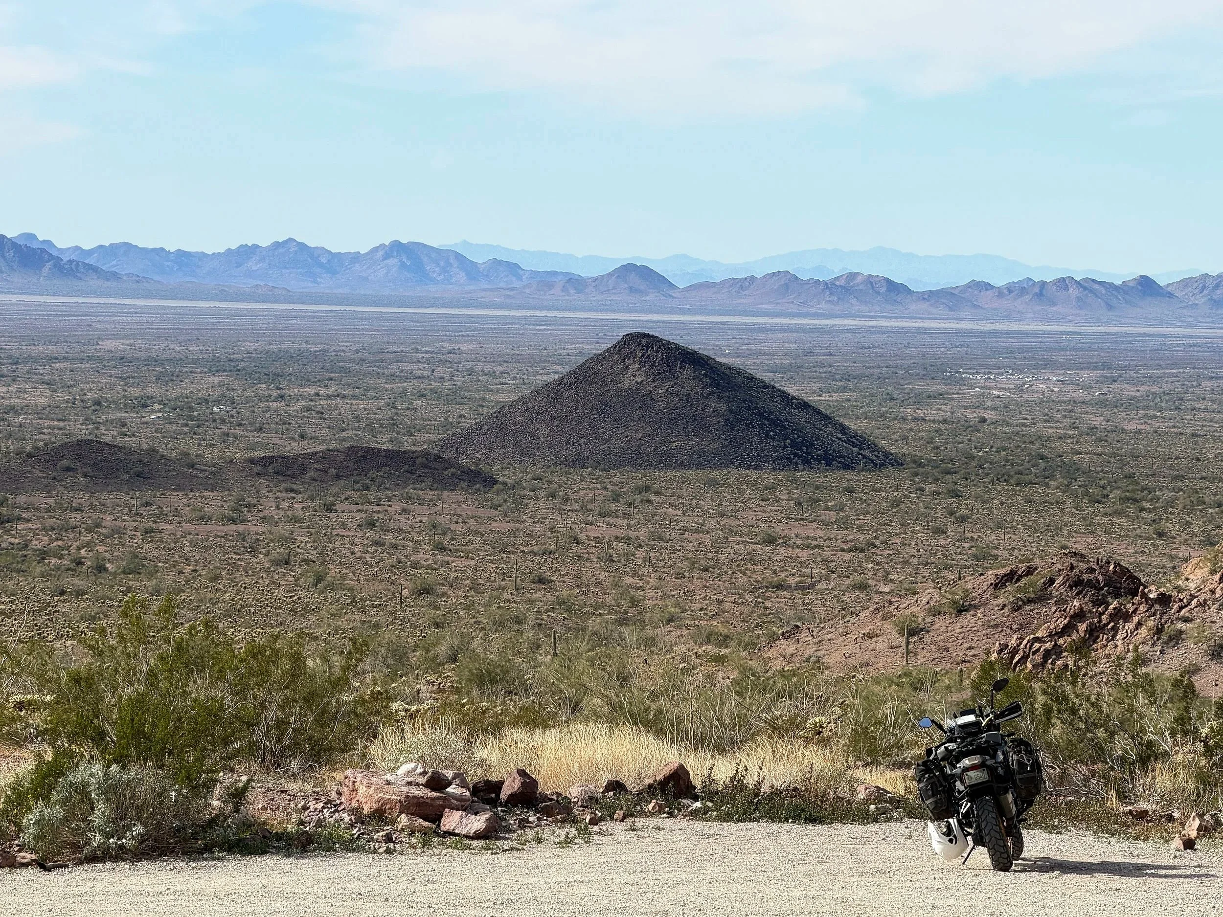 After returning to the bike, proceed on Palm Canyon Road back the way you came to the western boundary of Kofa National Wildlife Refuge where a cultural landmark punctuates the end of this route. Known as the “Spiral Labyrinth,” an unknown land artist created a 90-foot diameter spiral with 21 gravel circles on the desert floor, first appearing around 2010. It is located close enough to Palm Canyon Road that you can ride out to it. Finding it, however, can be the most challenging part. A symbol of growth, evolution, and spiritual journey, the spiral also represents life's cyclical nature, signifying change, connection, and continuous flow. In the center of the labyrinth lies an ancient Native American Kokopelli figure, widely regarded as a messenger, storyteller, and symbol of renewal. It is also common to find small keepsakes, messages, and memorial items left in the center of the spiral by others who have found its location. What better way to leave this special place than to spend some time here.